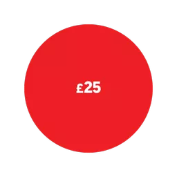 Self-Adhesive £25 Price Labels printed red on gloss white permanent paper. Labels measure 20mm in diameter.
